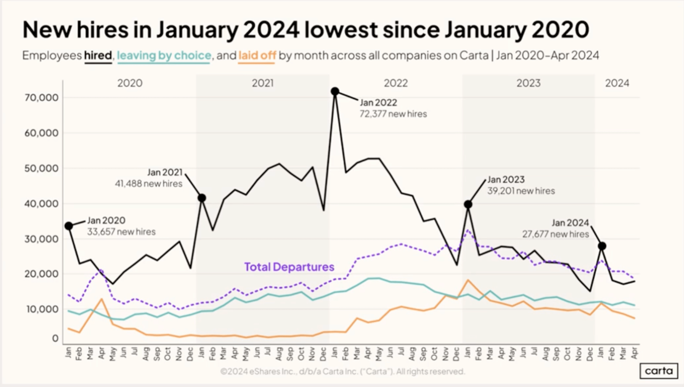A major challenge of global expansion is managing teams in diverse locations. Data from January 2024 highlights a significant decline in new hires—the lowest since 2020 (27,677 compared to 39,201 in January 2023).