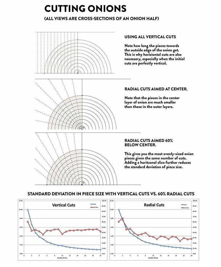 I stumbled upon a model that analyzes onion dicing built by a mathematician and the results are fascinating! It calculates the variation in piece size based on cut angle and spacing.